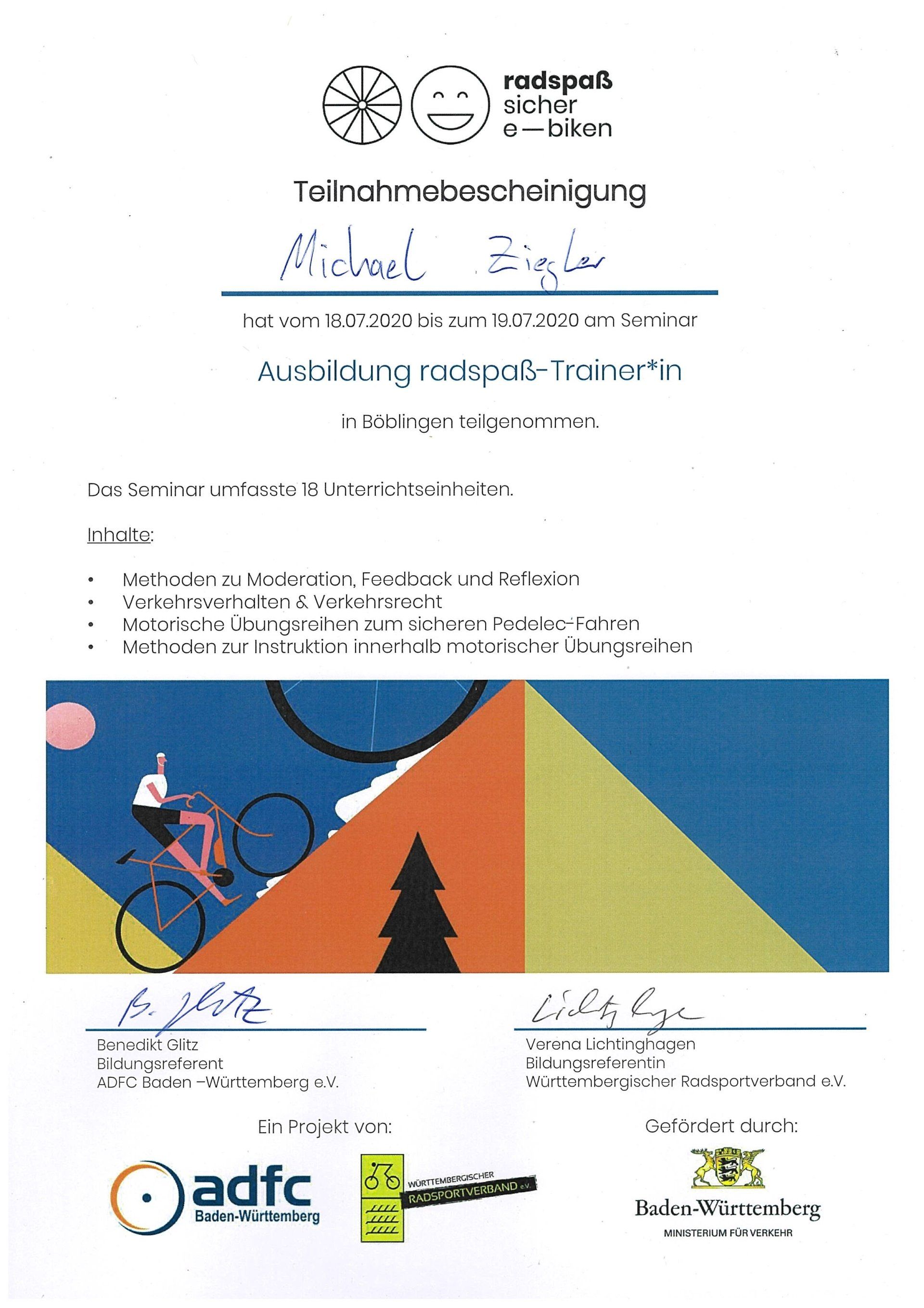radspaß sicher e-biken ist ein Projekt vom Allgemeinen Deutschen Fahrrad-Club und dem Württembergischen Radsportverband, gefördert vom Ministerium für Verkehr Baden-Württemberg.